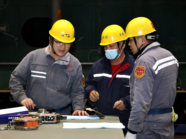 跨界转型,快速成长为生产骨干。张鹏同志毕业于徐州工程大学,曾从事建筑业项目经理工作,具备扎实的管理基础和强烈的责任担当。2024年10月,他怀着对造船事业的向往,跨界加入我们公司,现任分段制造部主管,负责2#车间G3跨生产管理工作。初入造船行业,张鹏深知分段制造对专业能力的严苛要求。为尽快胜任岗位,他白天扎根现场熟悉每一道工序,晚上钻研工艺标准和操作规范,遇到难题虚心请教。正是凭借这份韧劲,很快从业务新手成长为独当一面的生产主管。师傅丁凯说:“日常工作中,张鹏始终秉持‘事事有落实、件件有回音’的工作准则。面对工期紧、任务重的生产常态,他坚持每天提前到岗梳理计划,扎根现场协调解决堵点难点,用实干保障进度,用行动赢得信任。”