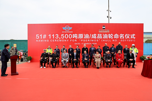 On March 11, 2026, a naming ceremony was held for one 113,500 DWT Crude/Product Oil Tanker bearing builder's hull no.0311551. The event was attended by the company's Executive Deputy General Manager Mr. Zhang Yuyong, General Manager Assistant Mr. Xu Zhenyu, Dynacom Site Manager Mr. Romeo Mustata and other distinguished guests.